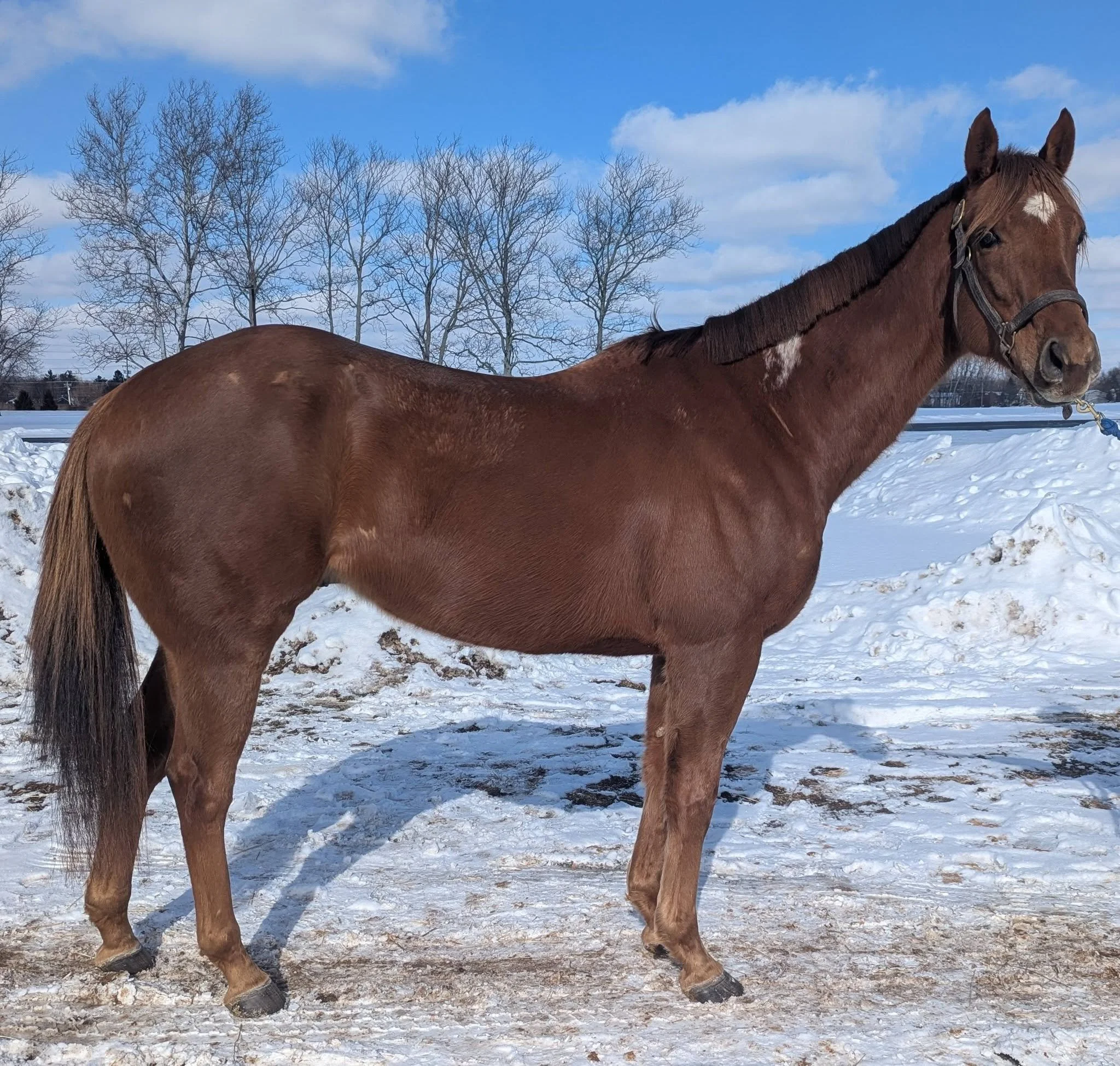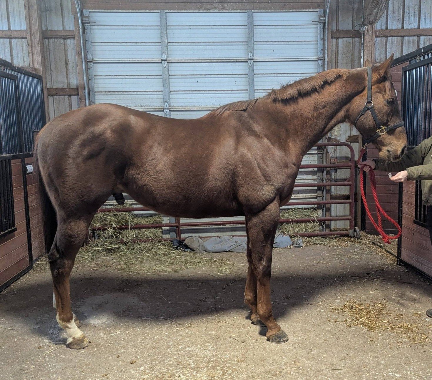 This girl retired sound with no known limitations. She is 2026 RRP Eligible and ready to be restarted. She just arrived so we do not have ride videos nor has she been restarted. Diva last raced 10/22/25. She is currently getting our regular grain plus a boost as we would like to see more weight on her.