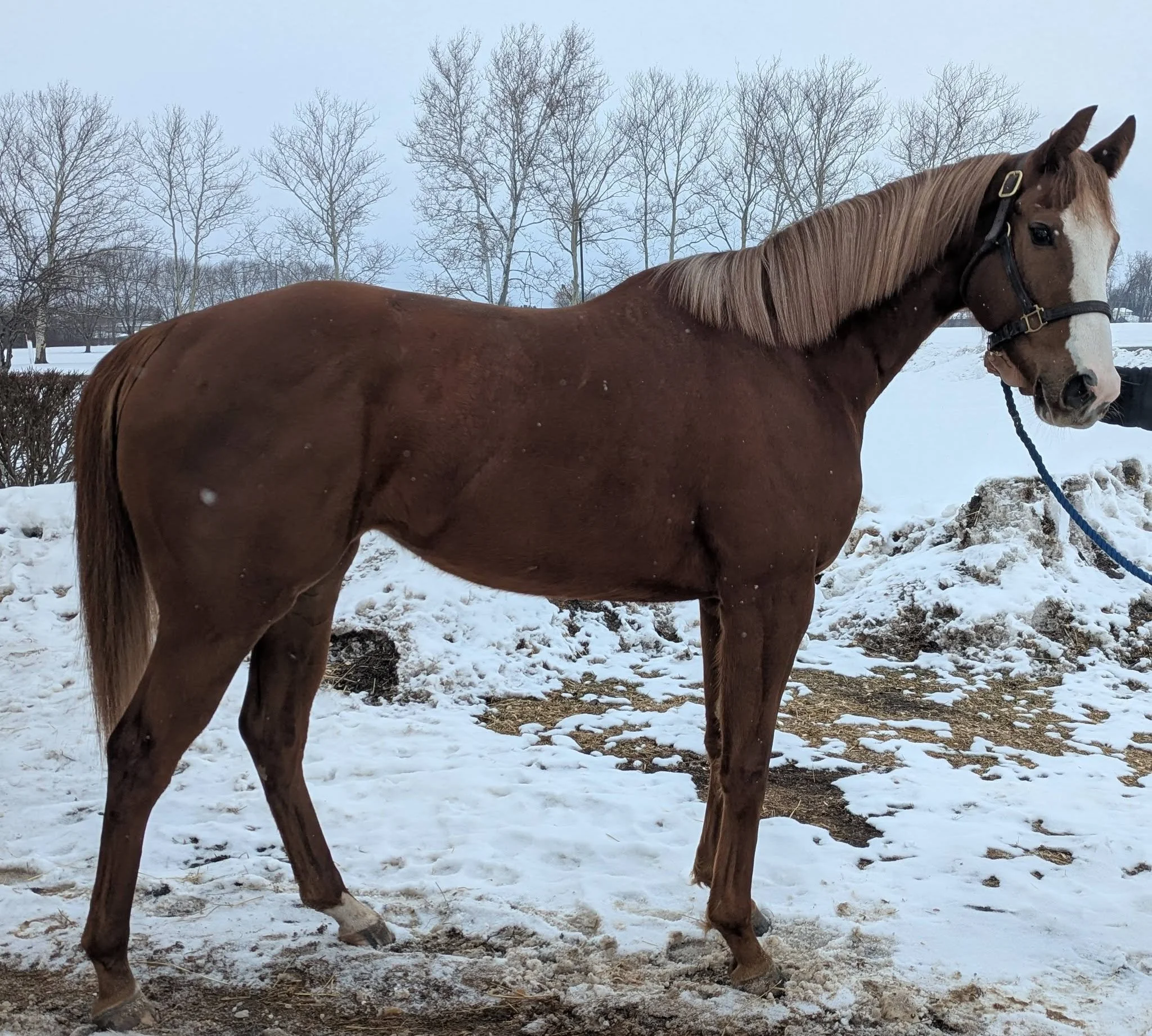 Chipped her knee in her last race 9/23/25. Was rehabbed and has been cleared for turnout and can start slowly back into work under saddle. Anointed is a spirited young mare that is looking for an experienced OTTB adopter.