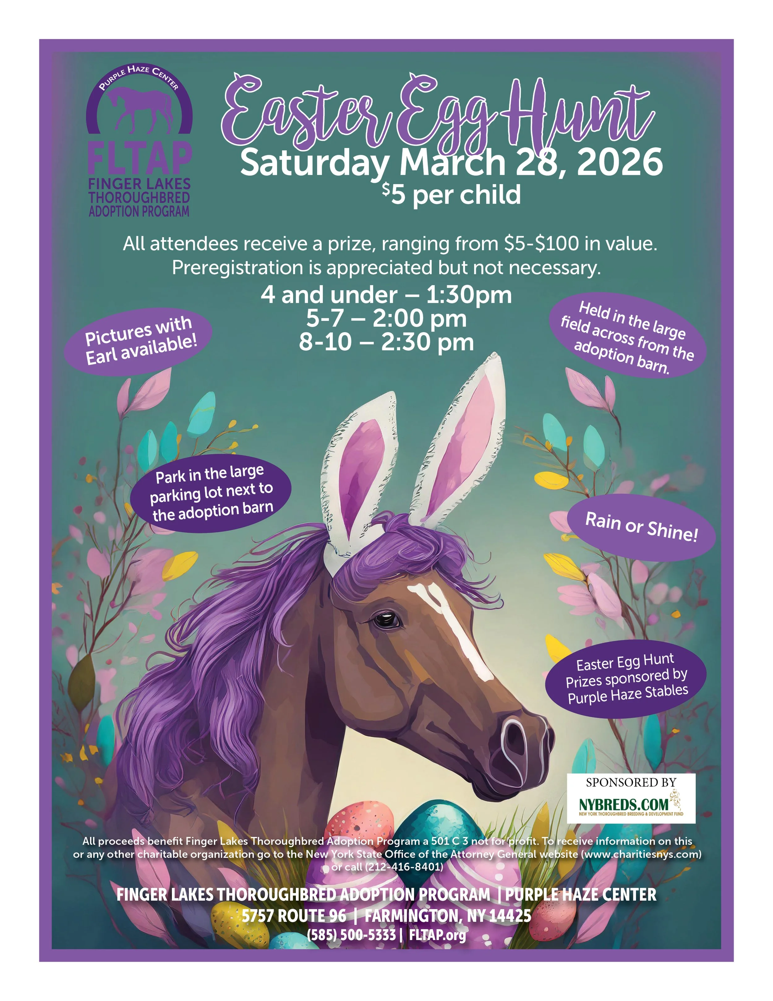 All proceeds from the listed events/fund raisers benefit the horse awaiting adoption at Finger Lakes Thoroughbred Adoption Program 501 (c) (3) not for profit. To receive information on this or any other charitable organization go to the New York State Office of the Attorney General website (www.charitiesnys.com) or call (212-416-8401)