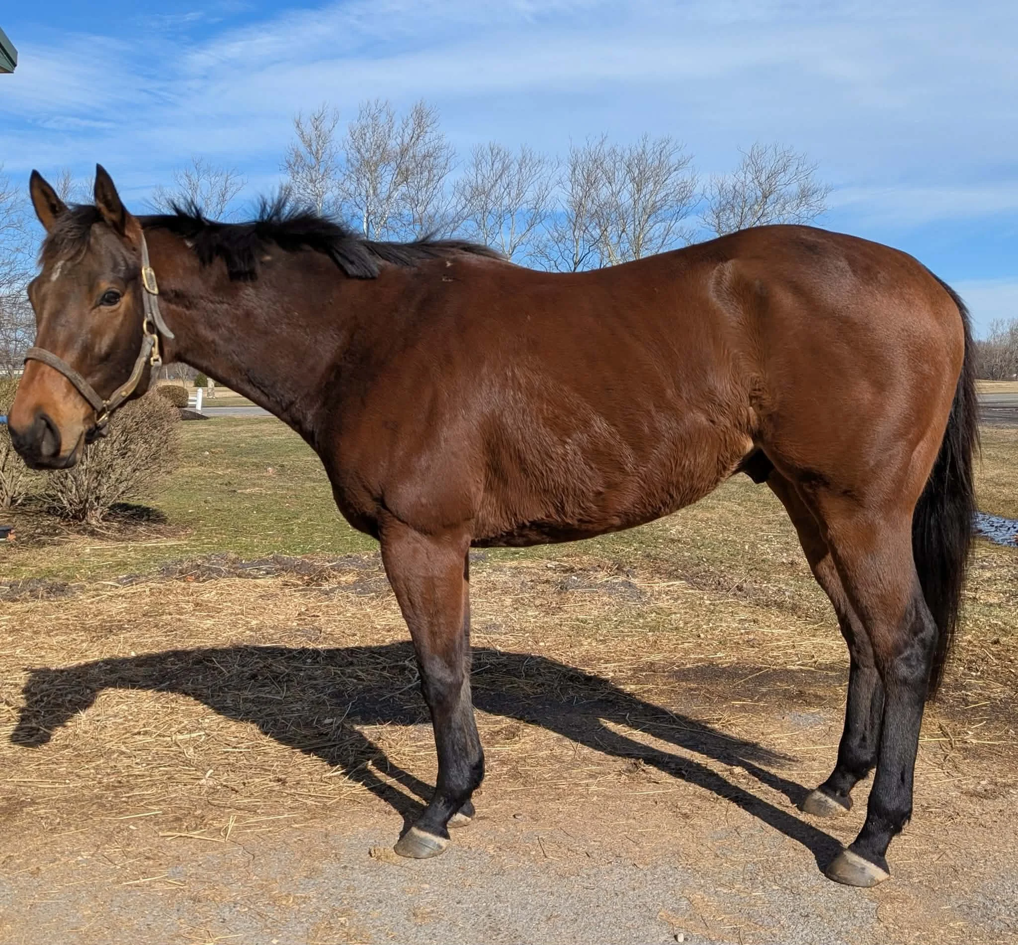 Just Words is a chestnut mare with flaxen mane and tail. This beautiful girl fractured the inside of her sesamoid after winning her last race on 9/24/25, She has been rehabbed and cleared for small turn out and can slowly be started back under saddle.